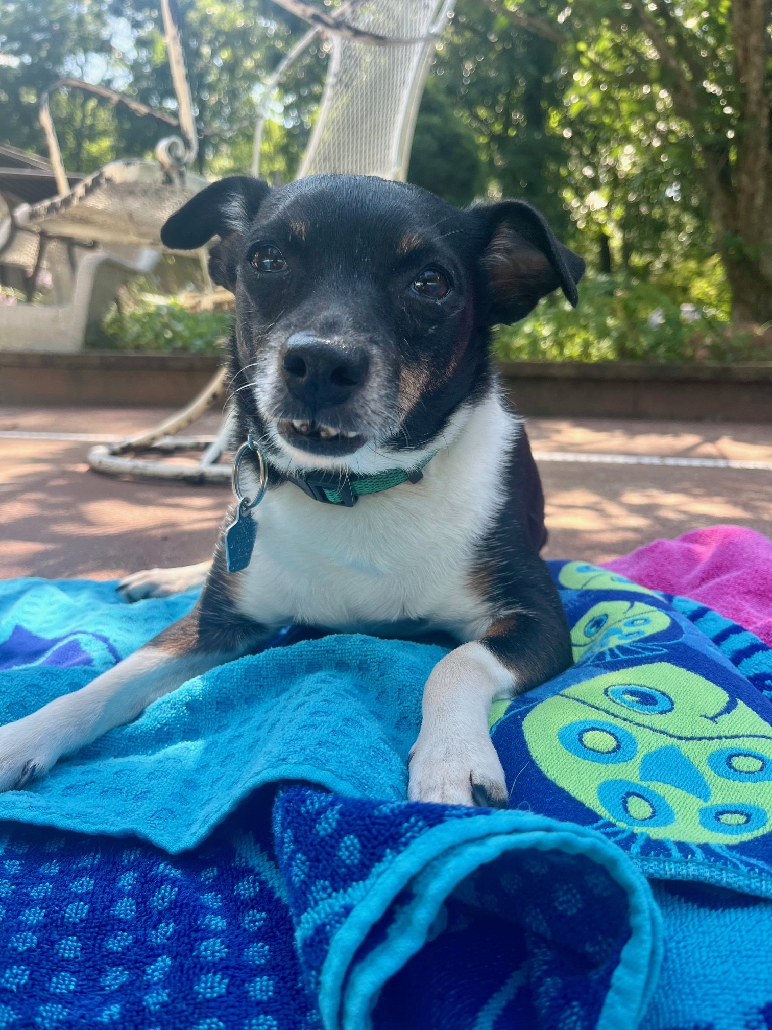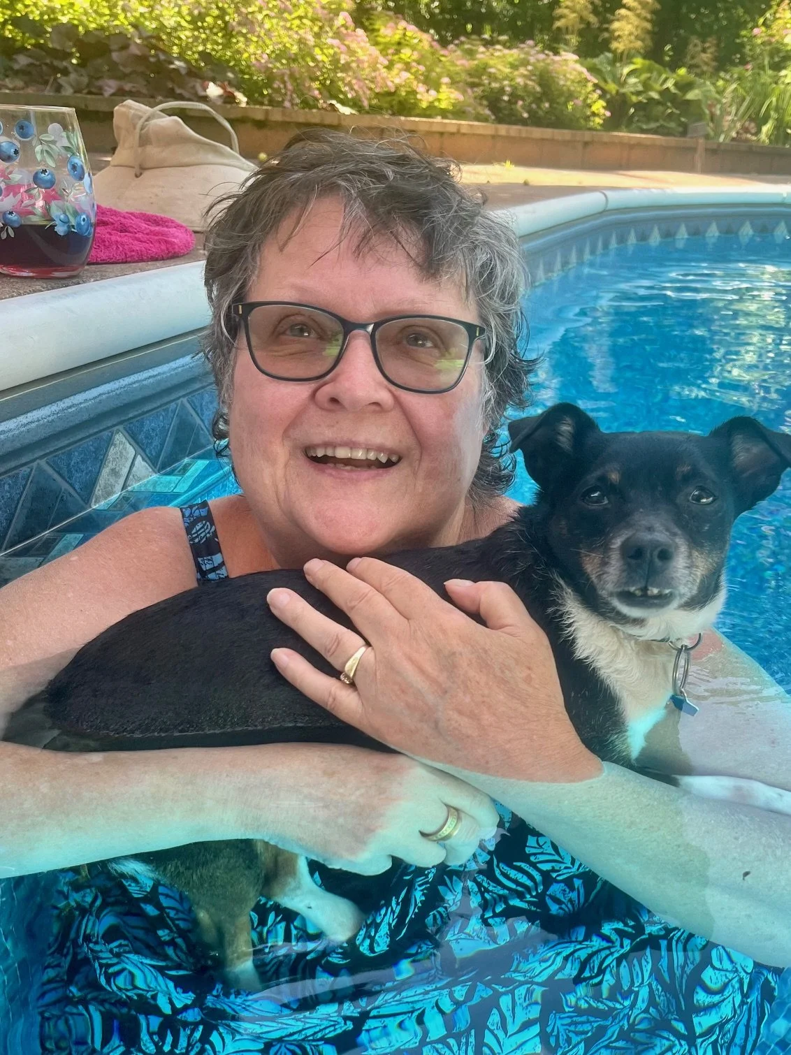 “Lola is the queen of our household!” Lola came to live with Judy, her husband and 3 other senior dogs. Since then, she has enjoyed her life spent lounging in or by the pool, chasing wildlife on their wooded property, and barking at the 4 wheelers that pass by on the trail. She has earned her spot at the head of the bed, curled up with her own little blanket, next to her mom and dad.